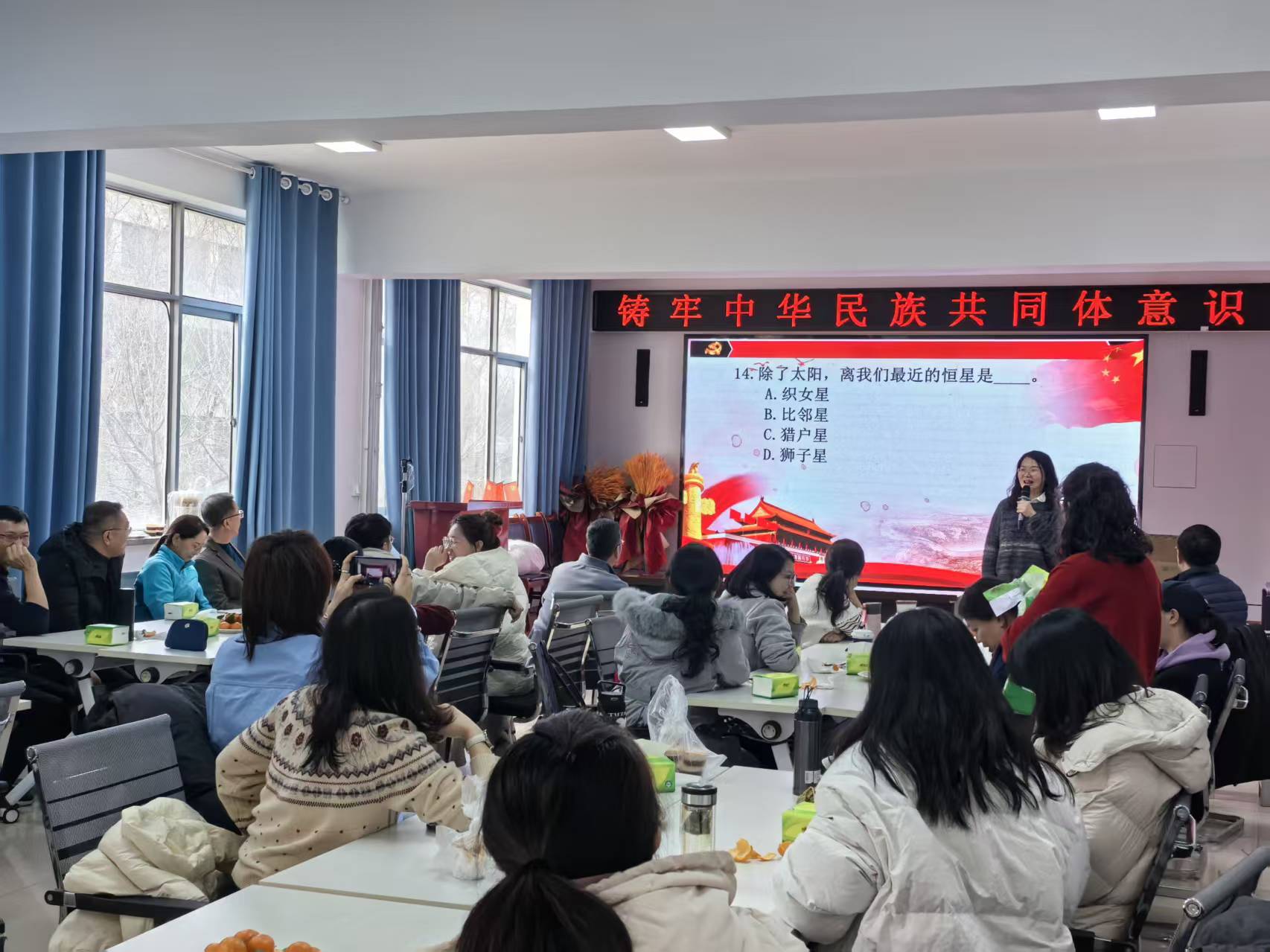 为丰富活动内容,增强互动趣味,活动中穿插安排了多项轻松有趣的游戏环节。在紧张刺激的“学习强国”知识抢答中,老师们展现出扎实的理论素养和广泛的知识储备,将现场变成了生动活泼的移动学习课堂;“你来比划我来猜”环节,老师们放下平日的严肃,用幽默夸张的肢体语言和默契配合引得满堂喝彩,笑声不断;“听歌猜歌名”环节,一段段经典旋律引发共鸣,大家或凝神细听,或脱口而出,在熟悉的歌声中重温岁月,感受文化魅力。这些游戏不仅有效缓解了工作压力,更在轻松愉快的氛围中加深了彼此了解,增强了团队凝聚力。