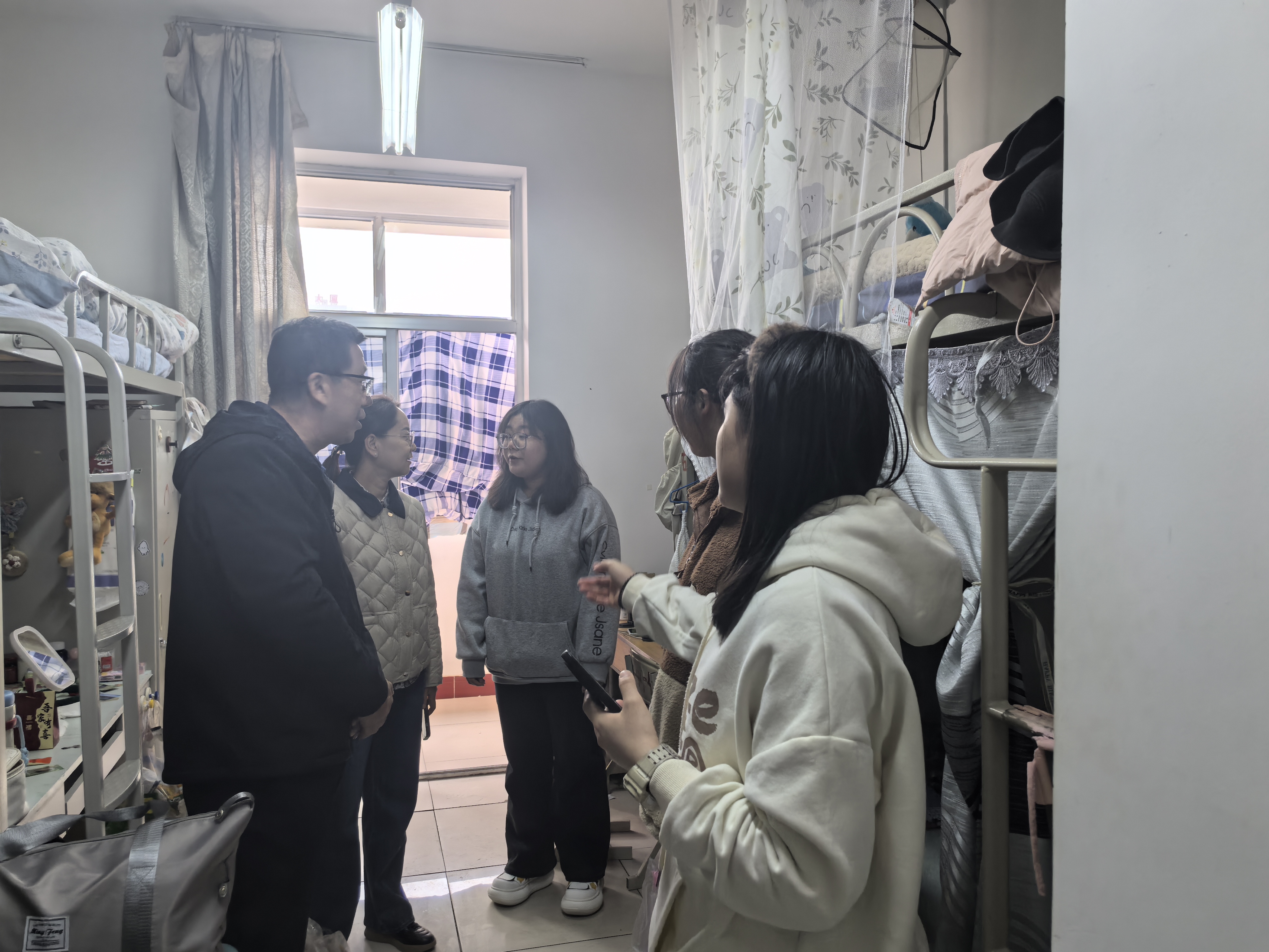 会后,学院领导与班主任一道进入学生宿舍,与学生面对面交流。